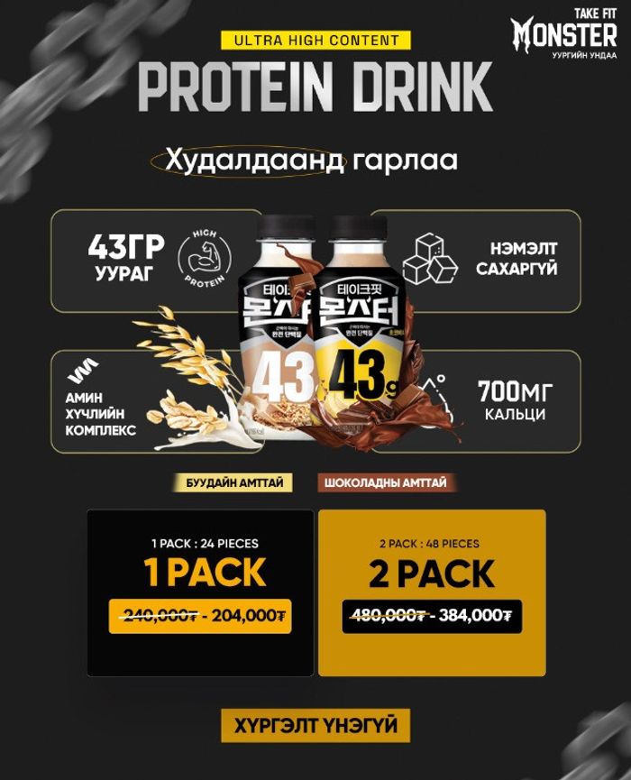TAKEFIT MONSTER нь бэлтгэл хийсний дараах булчингийн сэргэлт, хүч чадлыг хамгийн өндөр түвшинд дэмжихээр бүтээгдсэн өндөр агууламжтай уургийн ундаа юм. Whey уургийн онцгой найрлагатай тул хурдан шимэгдэж, булчингийн өсөлт, нөхөн сэргэлтийг шууд дэмжинэ.